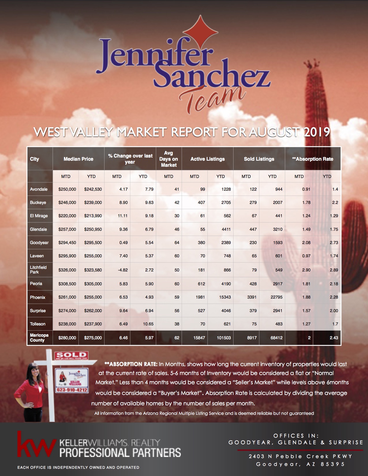 Hows the Market? Here is your West Valley Market Report for August 2019. Recently AZCentral reported that more than 200 people a day are moving to the greater Phoenix area, and from the boom in homes sales you cant argue with that. Closed sales in August complete blew away last years sales. El Mirage had an astonishing 71.8% increase over last year, Goodyear had a 33.7% increase, Peoria up 24.4%, Litchfield Park up 19.7%, closely followed by Avondale at 19.6% increase, Surprise 17.3%, Buckeye 17.2%, Tolleson 13.6%, Glendale at 13.5%, Phoenix was nearly flat with last year with slight increase of 0.7%. Only one West Valley cities fell short Laveen reporting -16.7%. Maricopa County was up 8% over last year, which made this August the third highest sales volume we have seen since 2004/2005!