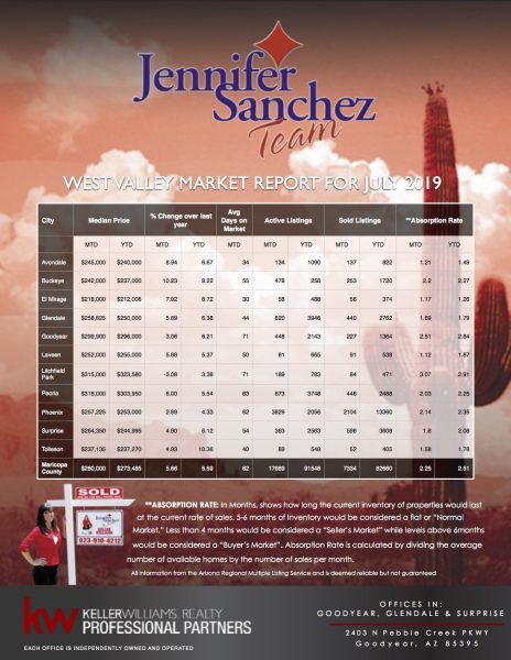 Hows the Market? Here is your West Valley Market Report for July 2019. All I can say is WOW!! They heat didn’t scare away home buyers!! All but two West Valley cities had an increase in sales over July 2018. Incredible month for closed sales in Goodyear with a 29.7% increase over last year, followed by Litchfield Park at 21.7%, Peoria at 21.2%, Laveen at 13.8%, Surprise at 13.6%, Phoenix at 7.1%, Glendale at 6.3% and Avondale at 4.6%. Only two cities came up short, Buckeye -4.5% and El Mirage -9.7%.